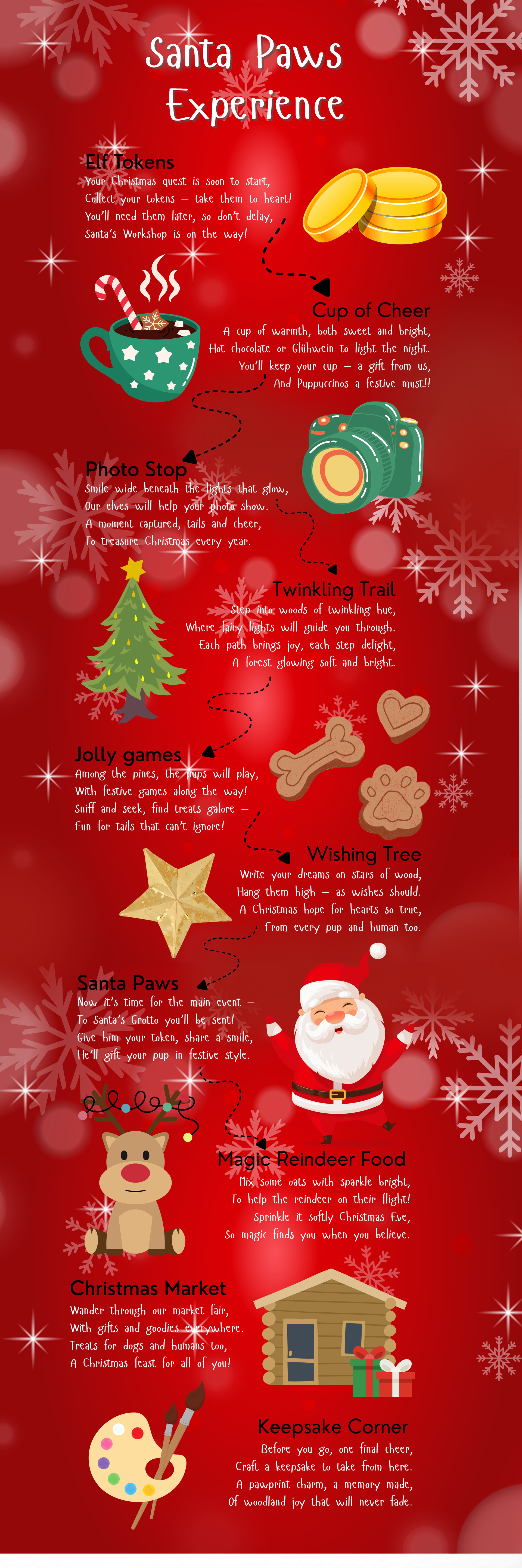 The Santa Paws Woodland Journey takes around 60 - 90 minutes to complete, depending on how much fun you’re having along the way! We recommend arriving 5 minutes before your time slot to fully enjoy the experience.